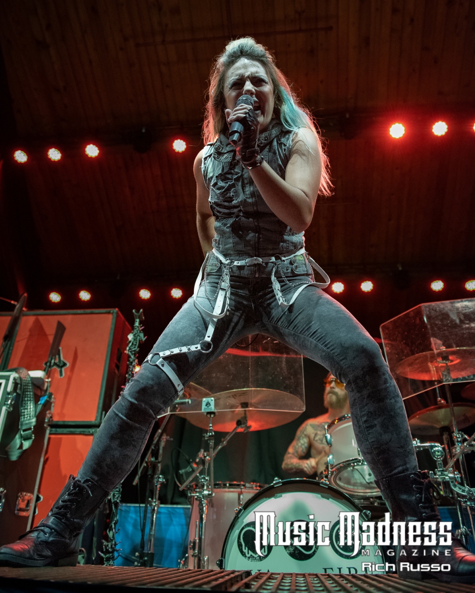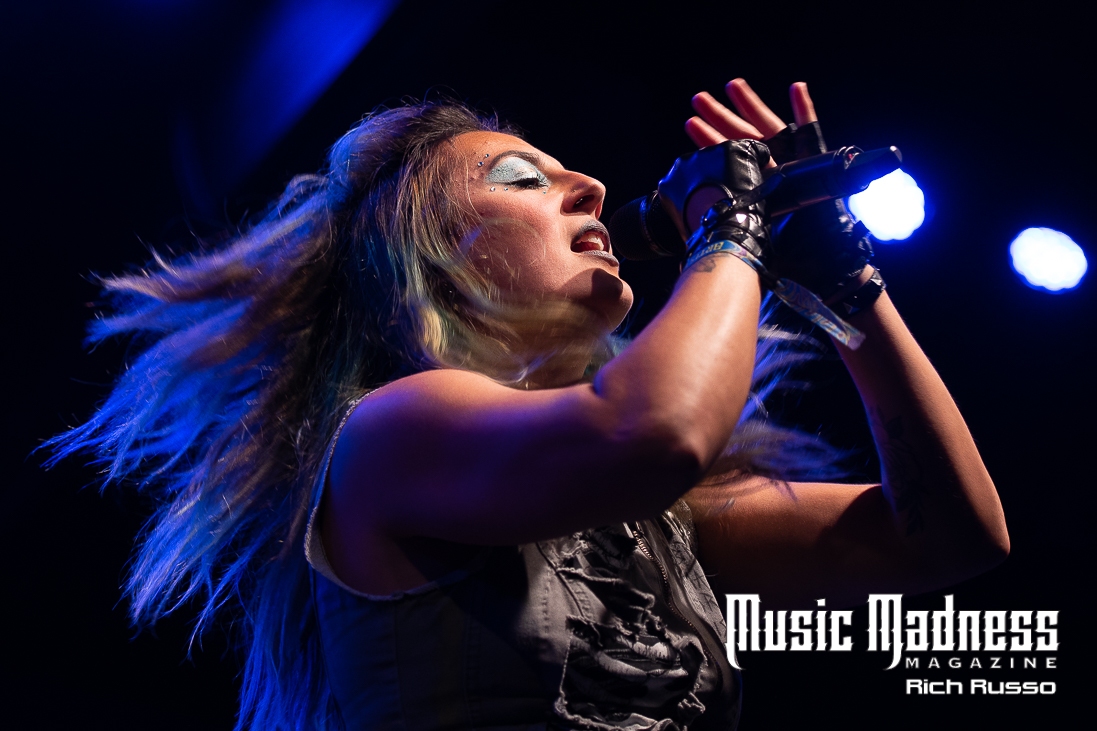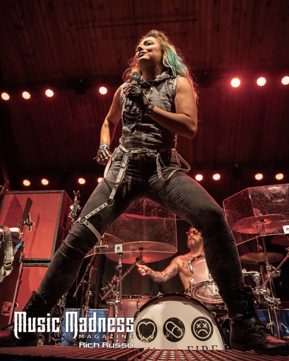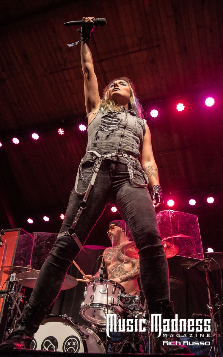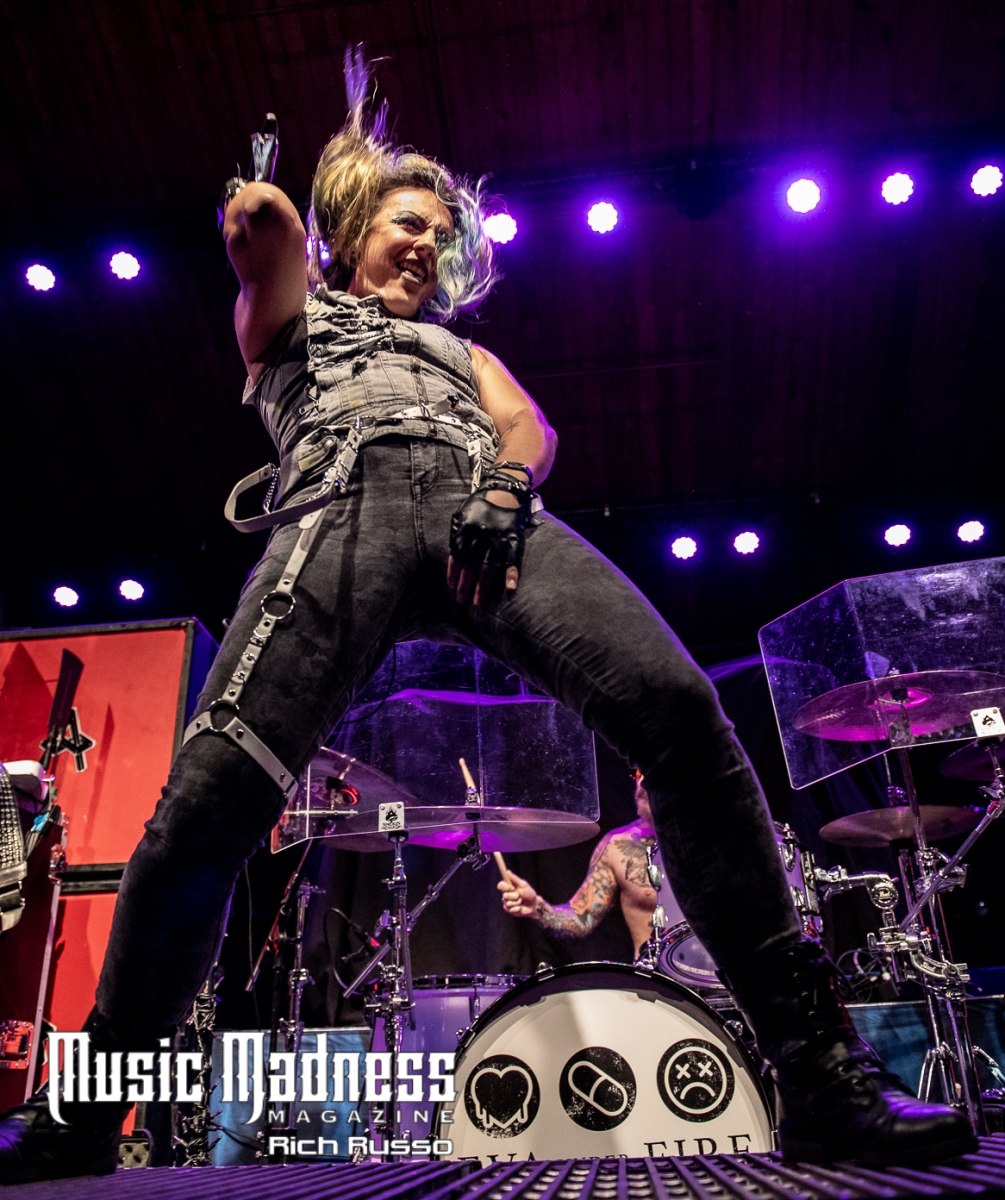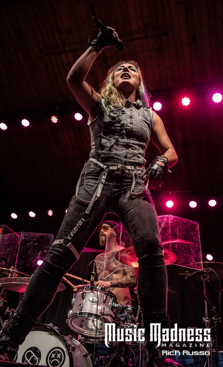 Eva Under Fire was the first band to take the stage. The band started out in Detroit in 2015. They are touring on their 2022 full-length release, “Love, Drugs & Misery”. These up and comers were very well received and the feeling was reciprocated. The band was clearly energized by the enthusiasm of their fans both old and those they had just made. Their modern hard rock sound has the aggressiveness of punk. This makes them fun to listen to as well as watch. Lead singer Amanda Lyberg (who also goes by Eva Marie) has a powerful voice and commands the stage. She is not one to stand in front of a mic stand and belt out her songs. No, she engaged the crowd with fist-waving and finger-pointing. This got the crowd engaged and energized as all good opening bands should!