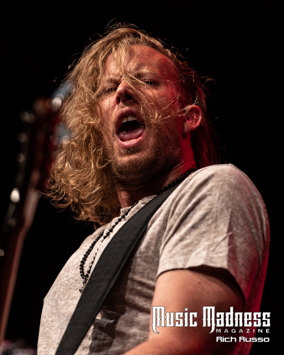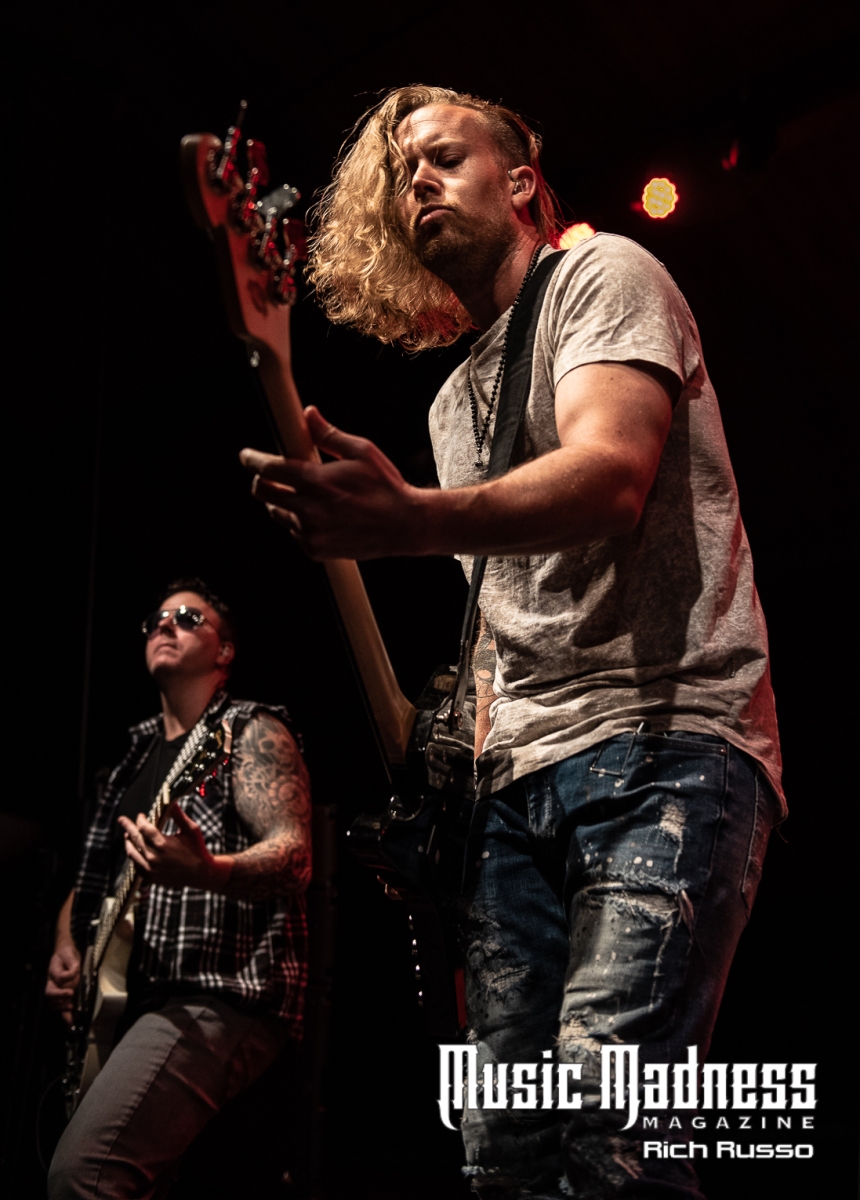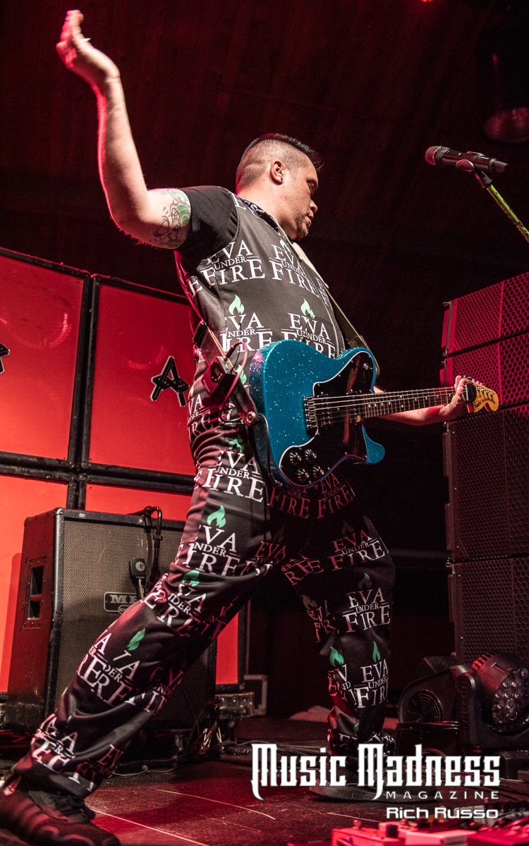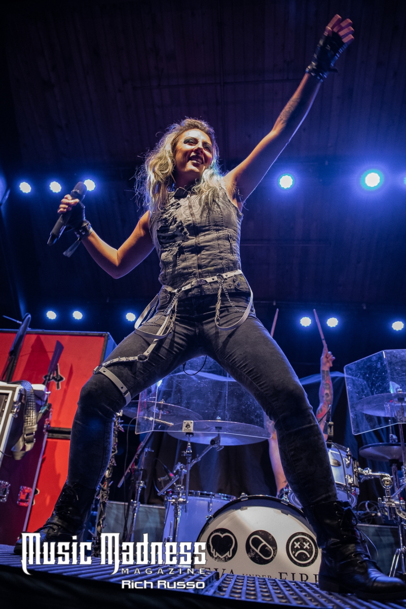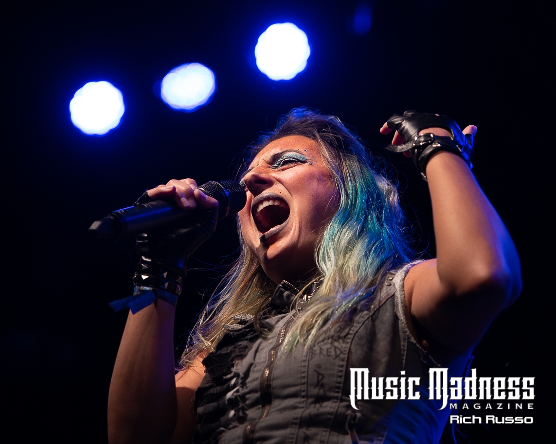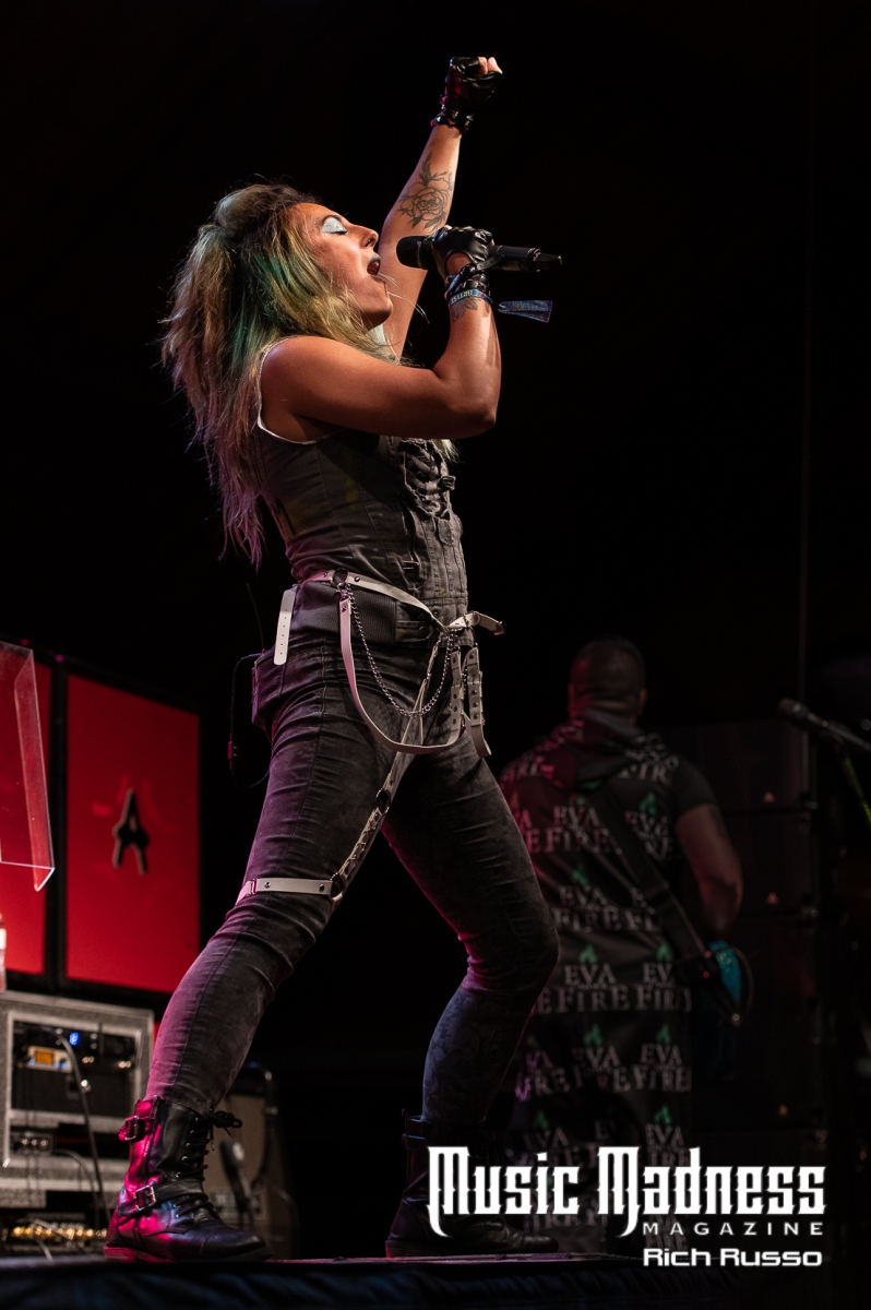 Eva Under Fire was the first band to take the stage. The band started out in Detroit in 2015. They are touring on their 2022 full-length release, “Love, Drugs & Misery”. These up and comers were very well received and the feeling was reciprocated. The band was clearly energized by the enthusiasm of their fans both old and those they had just made. Their modern hard rock sound has the aggressiveness of punk. This makes them fun to listen to as well as watch. Lead singer Amanda Lyberg (who also goes by Eva Marie) has a powerful voice and commands the stage. She is not one to stand in front of a mic stand and belt out her songs. No, she engaged the crowd with fist-waving and finger-pointing. This got the crowd engaged and energized as all good opening bands should!
